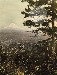 That's a hand-tinted postcard image of Mount Hood as seen from the top of Mount Tabor in East Portland in roughly 1900, and it's a picture from the Oregon Historical Society. Click on it, and it takes you to the OHS site, where you can look more closely at it and even buy a copy from OHS if you like.